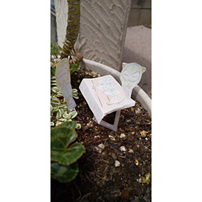 植木鉢の上でお花屋さんをしてるコスモと、シャドウとジェラルドにあげる花を買いにきたマリアを作りましたお店の土台はピザの真ん中についてるあれを使い、花はすずらんとわすれな草です。花言葉:すずらん再び幸せが訪れる わすれな草私を忘れないで、です