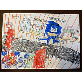 6歳、小学校1年生の長女が描いたものです。以前からソニックが大好きで、しょっちゅう絵を描いていますが、新しく買ったクレパスで最初に描いたのはこの絵でした。テーマとは関係なく恐縮ですが、小さなファンの渾身の作品を見てやってください。