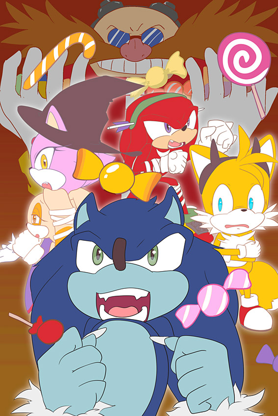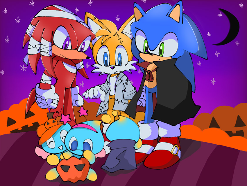 ソニック)おいおいもう少し夜を楽しもうぜナックルズ)ふざけるな!なんでこんな格好を...エミー)もう!せっかくのハロウィン何だから喧嘩しないの!テイルス)...可愛い...チーズ)月にうつっているのは誰の影かしら?絵の詳細はじめて沢山のキャラを1枚の絵にしました(初めてのファンアートです)