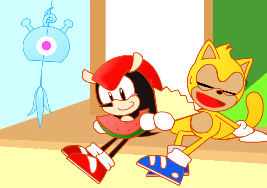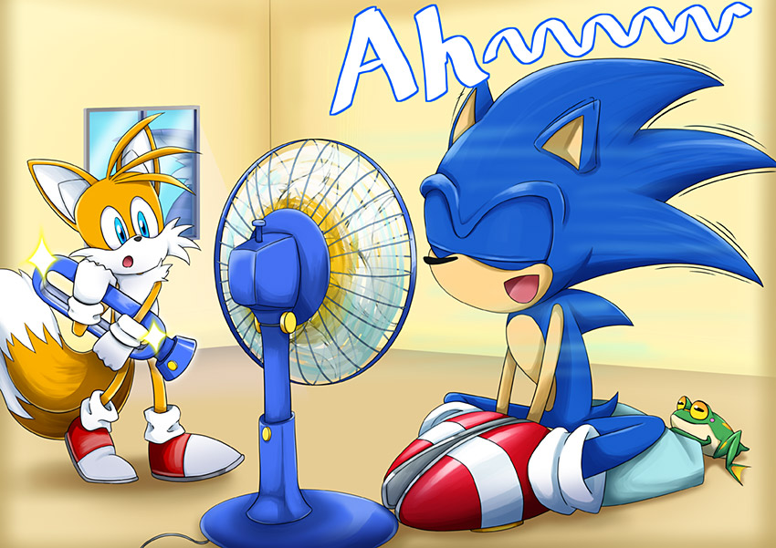 いつも走って風を感じるソニックが暑い夏の中、外に出なくても風を感じてるのを想像しました。テイルスの用意した羽なし扇風機よりプロペラ式のほうが風を感じられるのかもしれませんね。
