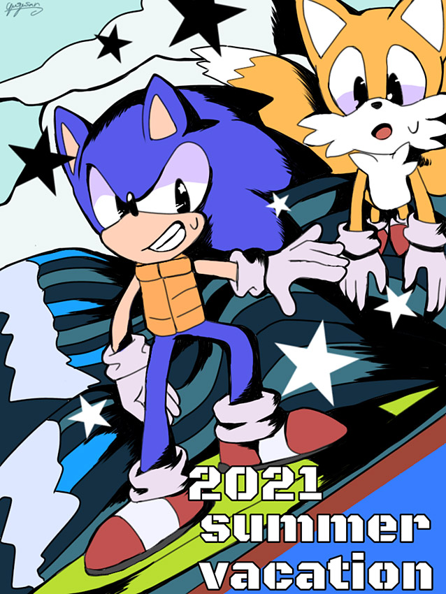 オリンピックやラッシュアドベンチャー等、ソニックは水は苦手でも波に乗るのは楽しんでそうだなと思ってマリンスポーツに出かけた所を描きました。