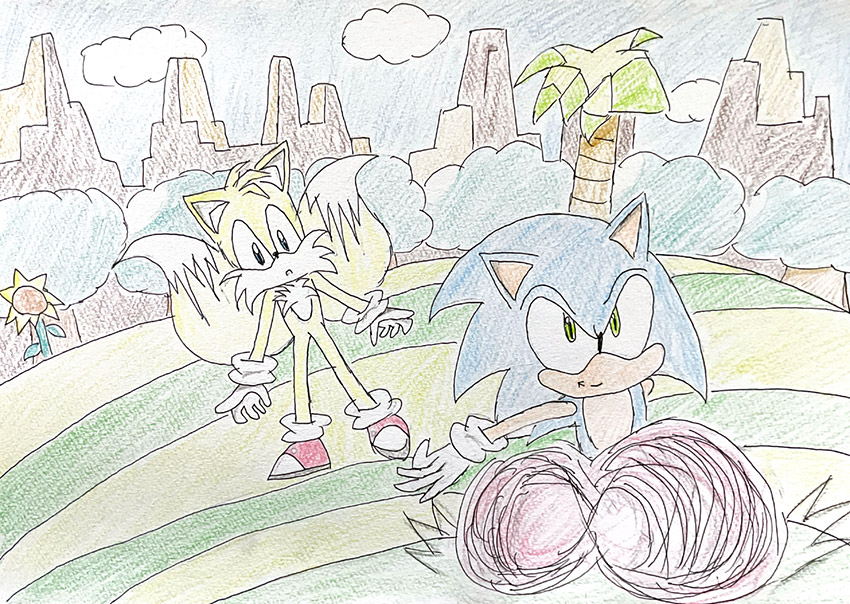 奥行のあるダイナミックな構図の作品です!得意げな顔で走るソニックと後ろでコースアウトしそうなテイルス、そしてどこかで走っているファングの図が面白いです。