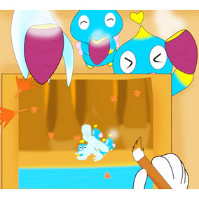 空に浮かぶ月を水面に映して見せるという演出がお洒落ですね!揺れる水面や美しく舞う紅葉から、秋らしい涼しい風が感じられる作品です。