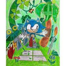 待ってソニック~!と声が聞こえてきそうなイラストです!エミーの満面の笑顔に対しソニックの表情が面白いです。背景も丁寧に描かれているのが伝わってきます!