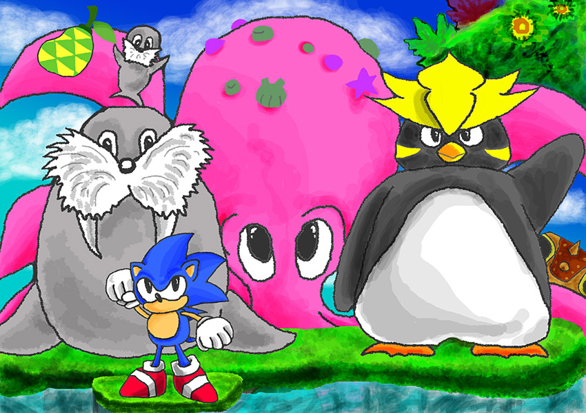 プレイした第一印象は"動物が大きい"でした。ペンギンと海獣が好きなのとタコ!タコ!なので海系で。ちょうどソニックで巨大イカと戦いたい欲が高まっていた時でしたのでタコがとても嬉しかったです。タコを描くためにスクリーンショットを撮ったらいました、こんな所に!