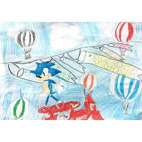 ソニックとテイルスがトルネード号に乗って鯉のぼりを見に来ている所を描きました。