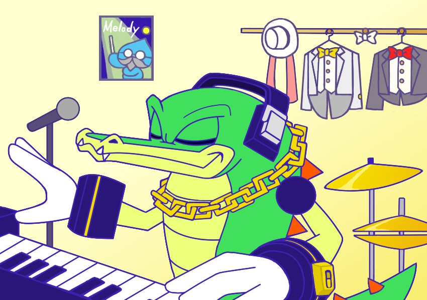 満足げな表情で鍵盤に向かうベクターを描いてくれました。大きな身体で繊細なメロディーを奏でるそのギャップに新鮮な驚きと新たなベクターの魅力を感じるイラストです。