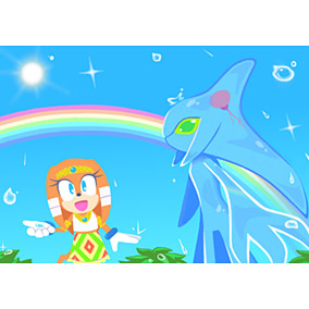 遊びたいざかりのチャオに翻弄されているソニック?!とても微笑ましいシチュエーション。丁寧に描かれた背景と目の覚めるような青空がとても美しい一枚です。