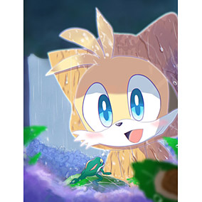雨の日のカエルくんはいつもよりご機嫌かも?喜ぶテイルスの顔が可愛いです!跳ね返る雨粒や濡れているレインコートなど、臨場感あふれる描写も目を惹く作品です。
