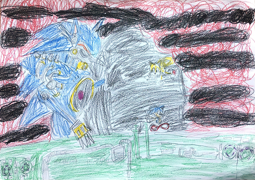 メタルソニックの描きこみがすごくてかっこいい!赤と黒に染まった空も迫力があります。戦いの緊迫感が伝わってくる作品です!