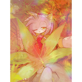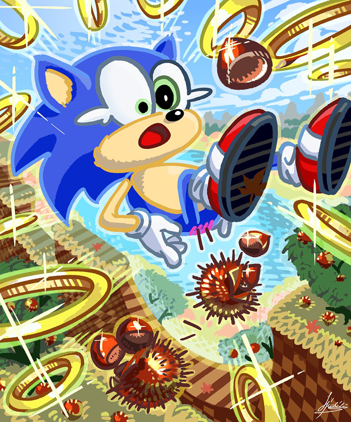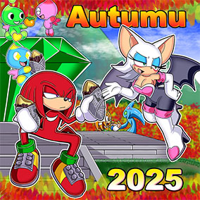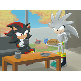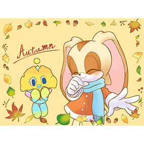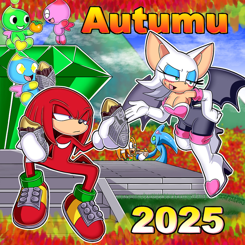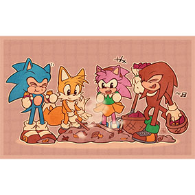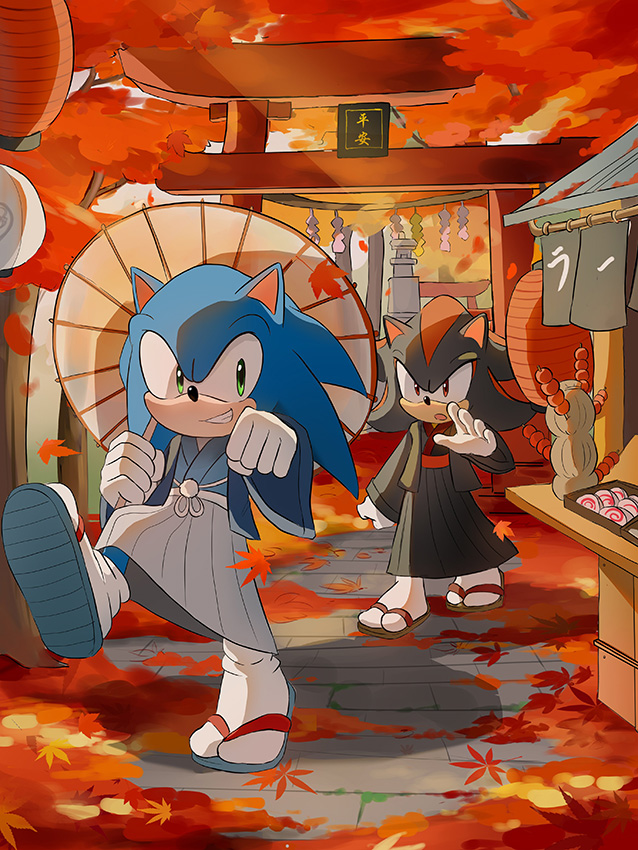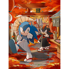 秋らしい色彩が美しい作品!神社を彩る紅葉たちと、ソニック達の装いがピッタリです。屋台で売られている食べ物も気になってしまいます。