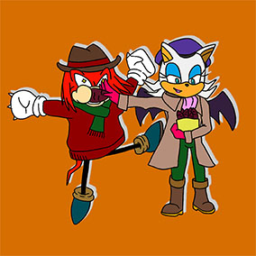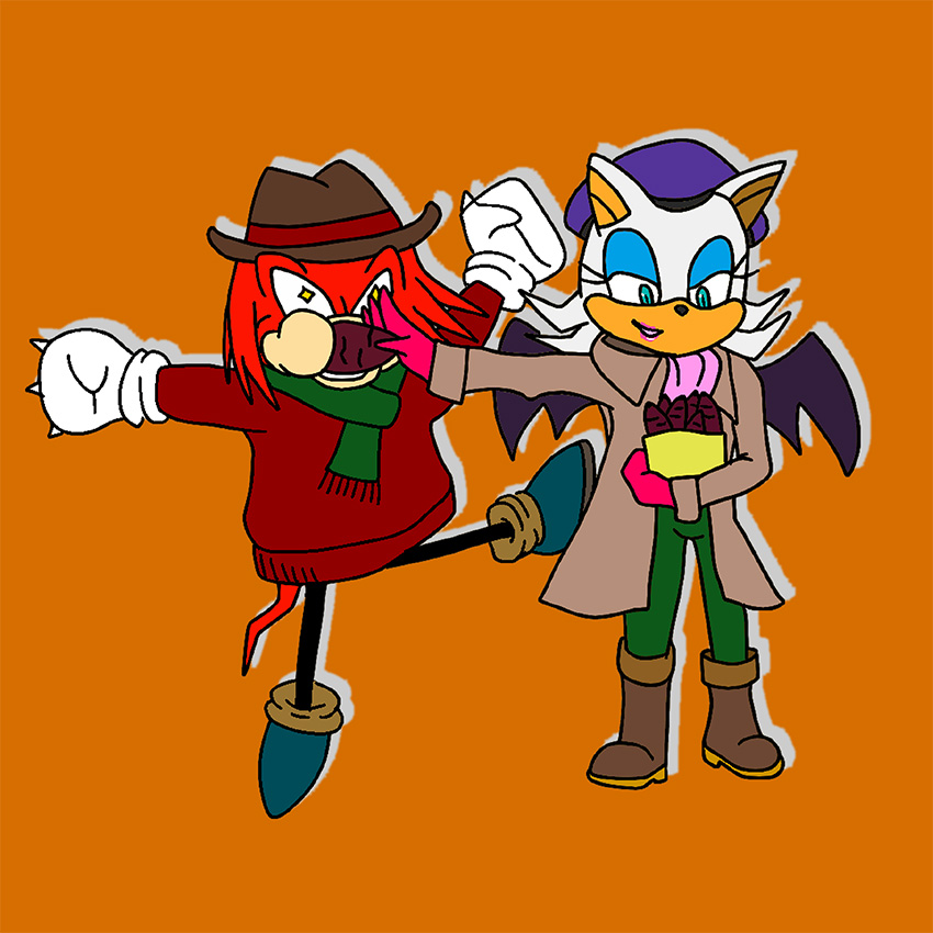 大好きな焼き芋をたくさんナックルズに買ってもらったルージュ。金を払ったのは俺なんだから最初は俺に食わせろとナックルズ。適当に口に芋を突っ込んでいなすいつも通りのルージュ。そんな日常を描いてみました。ナックルズが焼き芋を買ったのもルージュの口車に乗せられたからでしょう(笑)