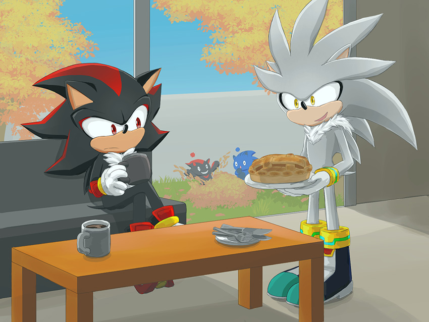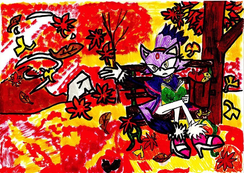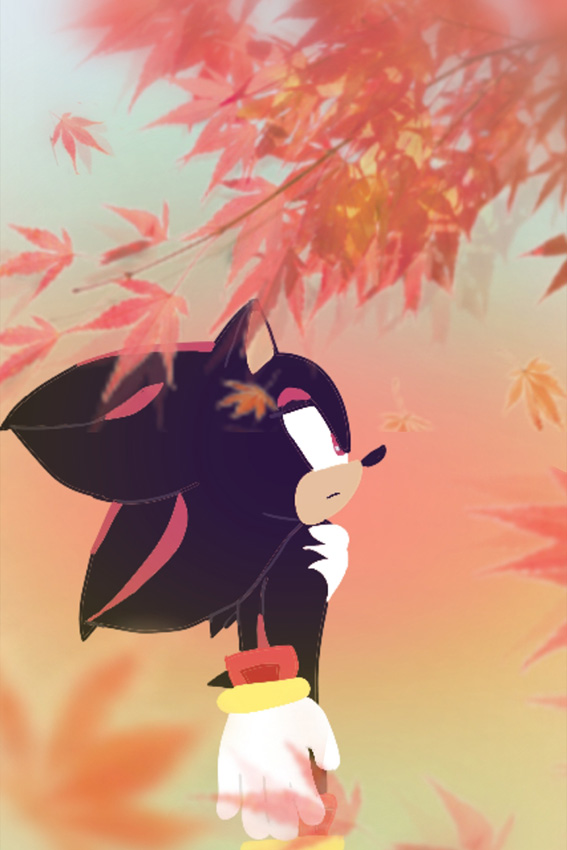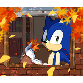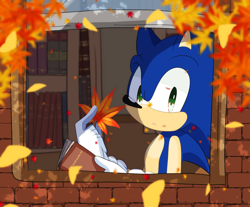 図書館で本を読んでる最中に紅葉が本の上に落ちてきて、それを拾って窓を眺めてるソニックを描きました。