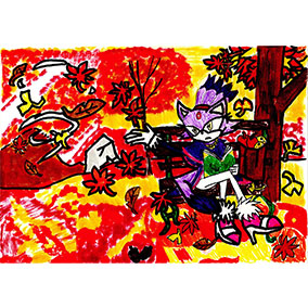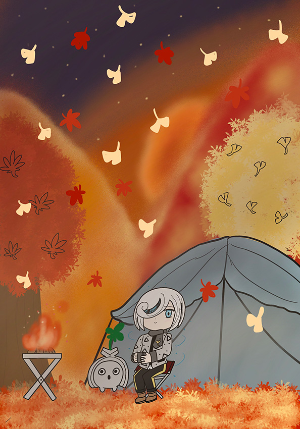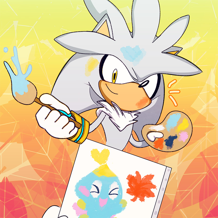 少し得意げに描き上げたキャンパスを披露するシルバー。意外と絵心はあるようで...?!背景の秋色グラデーションも美しい作品です。