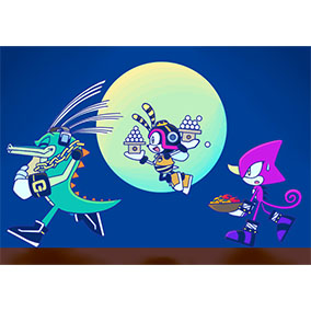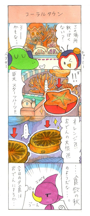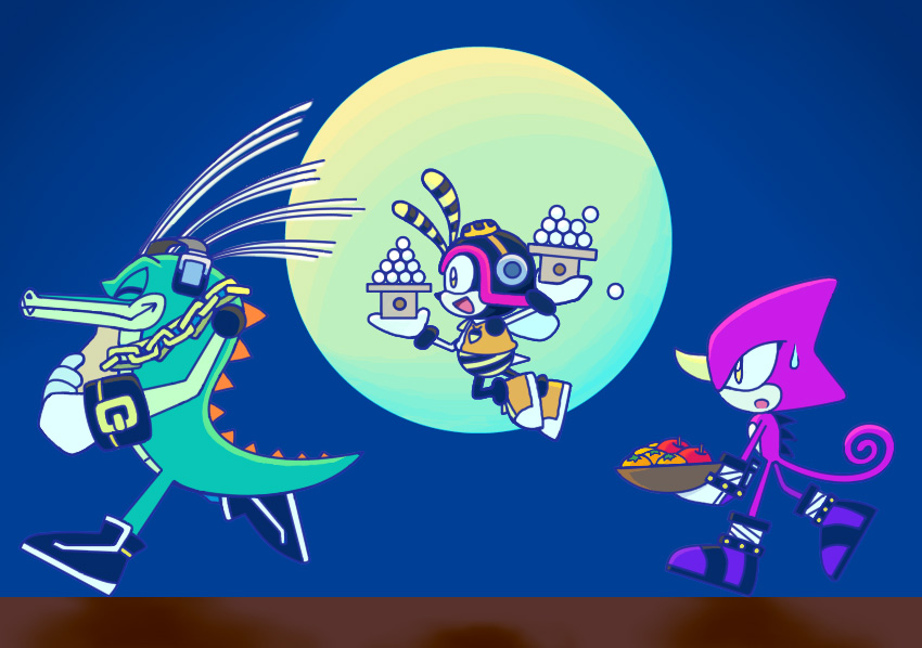 ヴァニラさんと一緒にお月見をしようと張り切るベクター。そうしたらエスピオとチャーミーも協力することになるんだろうなと思いながら描きました。でもヴァニラさんのところに到着した頃には既に準備が完璧に終わっていたりして。