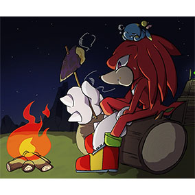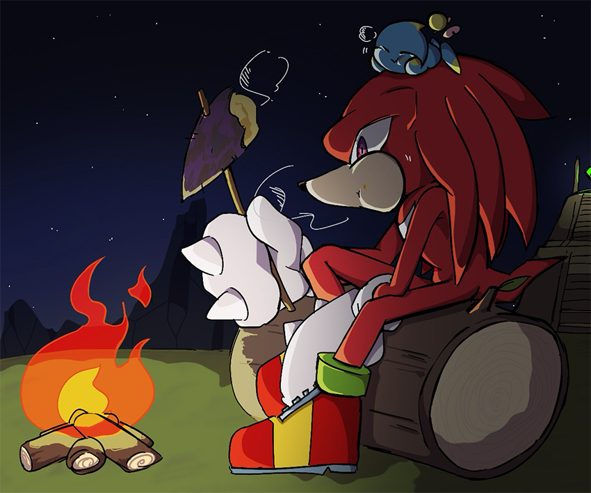 ナックルズのもとにルージュが訪れてきました。ナ「お前も食うか?」ル「えっ、し、しょうがないわね、どうしてもと言うんなら貰ってあげるわ。」ナ「・・・いらねぇならいいんだぞ?」ル「いらないなんて言ってないでしょ!!」焼き芋の香りに引き寄せられた意外な来客でした。