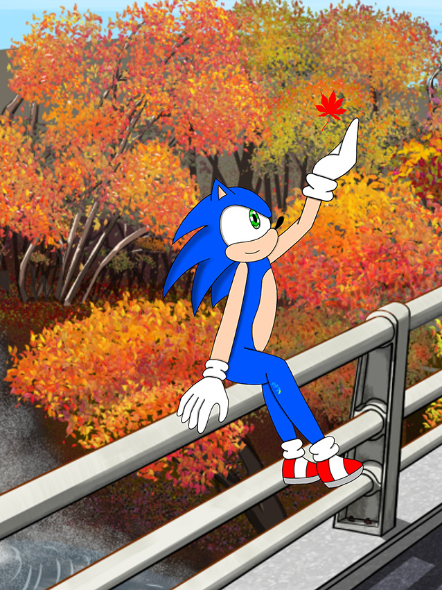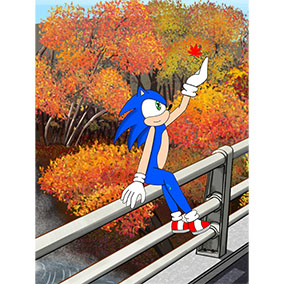秋と言えば紅葉。紅葉と言えば嵐山。なので嵐山の渡月橋の欄干に座って紅葉を楽しんでるソニックを描きました。タイトルの「ひらり舞い落ちる」は紅葉が手のひらに舞い落ちる様子です。