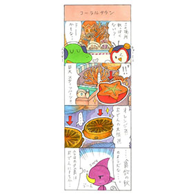 銀杏の葉で遊ぶチーズと、微笑むクリームの笑顔が本当に可愛く、微笑ましいですね!秋らしい色調で統一された彩色も良いと思います。