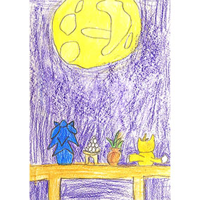 大きな満月が迫力満点で綺麗ですね!夜空の中、とても輝いて見えます。月を見上げる二人の小さな後ろ姿が可愛らしいです。