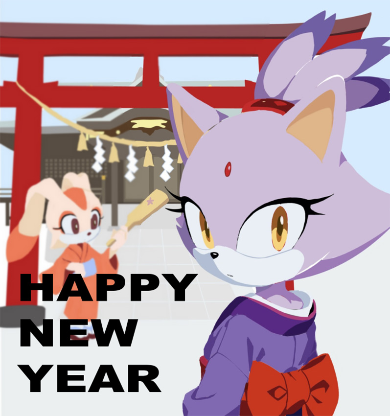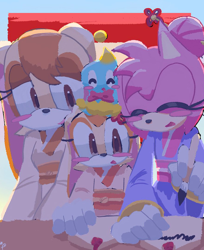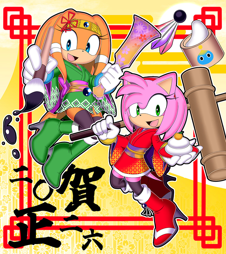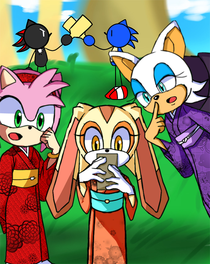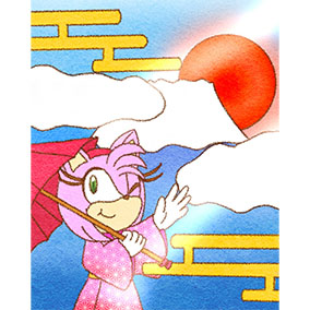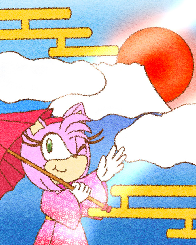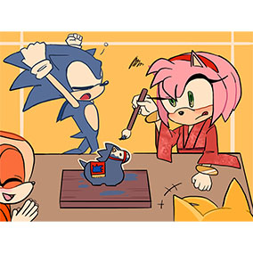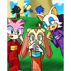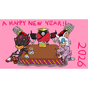 ___お正月だからとご機嫌なクリームはテイルスが作ったおみくじを引いたようです。何が出たのかエミーとルージュは興味津々のご様子。 そんな三人を尻目に、ソニックとシャドウはなにやら羽子板で勝負を始めようとしています___個人的に大好きな女性キャラ三人を描かせていただきました!