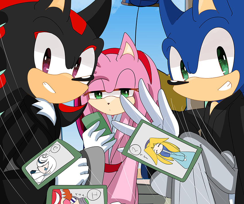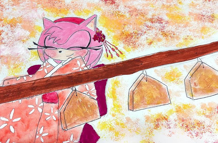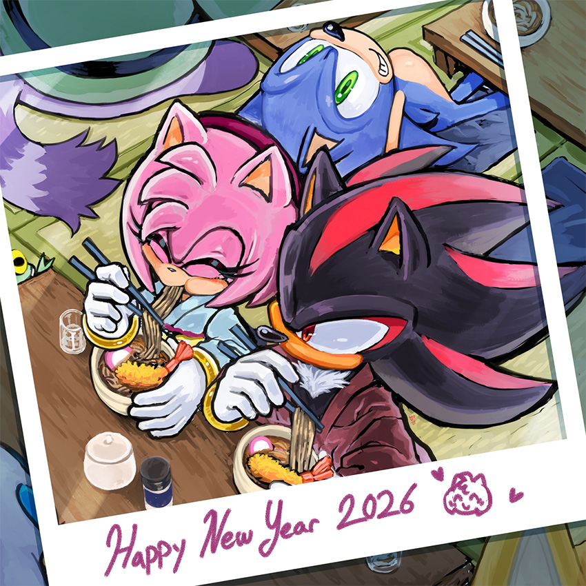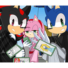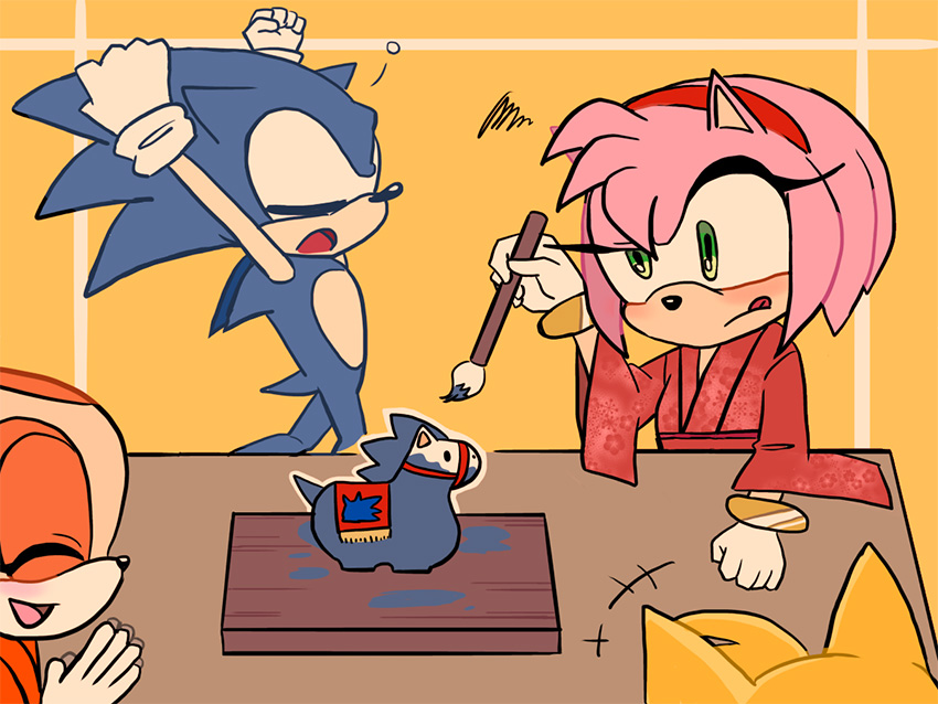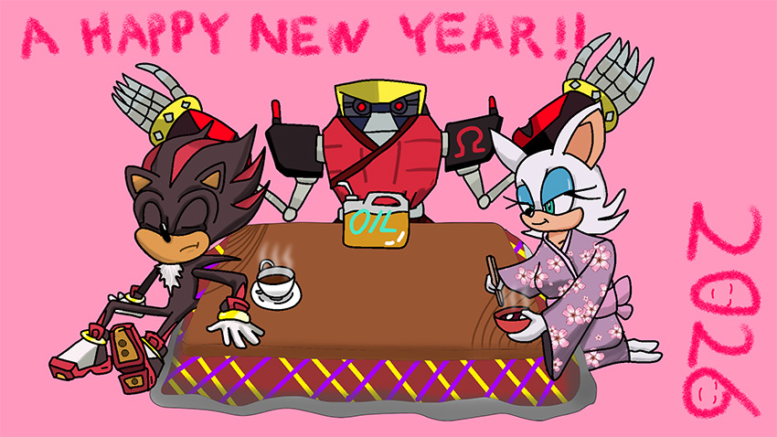 ___お正月だからとご機嫌なクリームはテイルスが作ったおみくじを引いたようです。何が出たのかエミーとルージュは興味津々のご様子。 そんな三人を尻目に、ソニックとシャドウはなにやら羽子板で勝負を始めようとしています___個人的に大好きな女性キャラ三人を描かせていただきました!