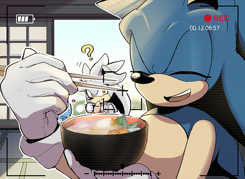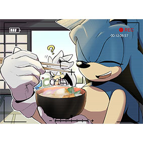 「シルバー餅〜!なんてな!」カメラを向けられたので、縁側にいるシルバーをお餅に喩えて、掴んでる風に見せようとしたソニックのちょっとした悪ふざけ!