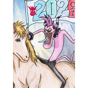 午年なので乗馬をするザズを描きました。初日の出の見える絶景スポットで、勢いよく新年を迎えるザズですが。どこからか連れ出された馬は少し困っています。
