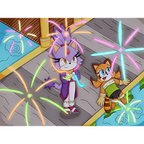 夜空の花火をバックにポーズを決めるソニックたちがカッコイイ! 新しい冒険に向かって動き出す予感を感じさせる一枚です。