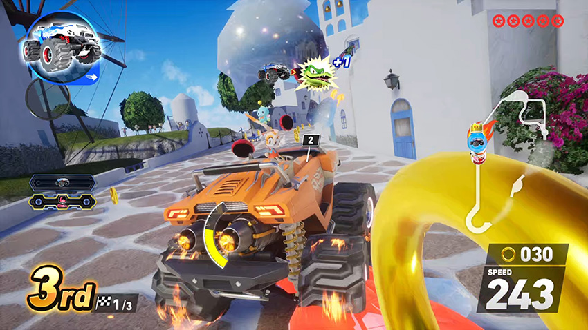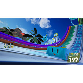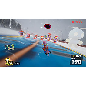 イカのゲソに当たらないかヒヤヒヤするこのコース、最後はイカの口に突っ込むという(笑)...。一秒一秒目まぐるしく変わっていくレース中には、そんなこと気にするライバルはいなさそう。