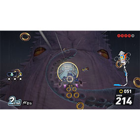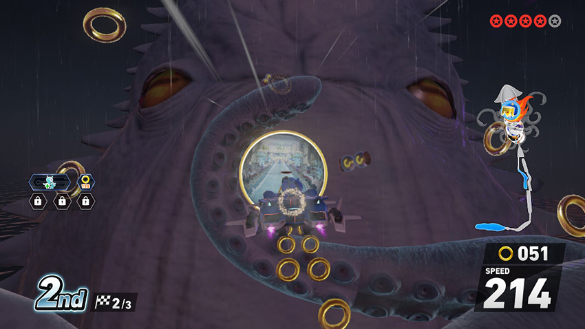 スリル満点、大迫力の一枚!超巨大イカの口に突撃!と思いきや、トラベルリングへ!クラーケンベイのミニマップ演出は、遊び心満載ですよね。全速力のソニックも、このカオスっぷりに目を丸くしているかも!?
