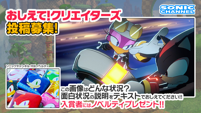 ソニックチャンネルでは「ファンアート」「スクリーンショット」「教えてクリエイターズ(大喜利)」を大募集!お気に入りのキャラクターや、あなたならではのソニックワールドを存分に表現した作品をぜひご応募ください。