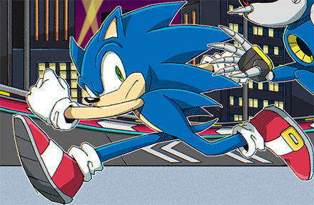 その瞬間、2つの青い影が、夕闇の摩天楼のライトに照らされながら路上に躍り出ます。どちらの音速が上なのか、雌雄を決するレースが始まったのです。