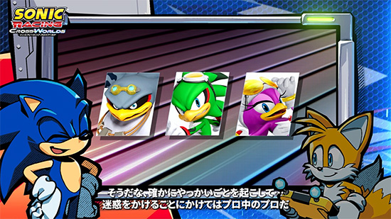 おなじみソニックとテイルス、そして彼らのライバルであるジェットとウェーブのコンビが、彼らの目線で『ソニックレーシング クロスワールド』に参戦する23人ものレーサーをまとめて紹介してくれる、ゴキゲンなトーク番組です!