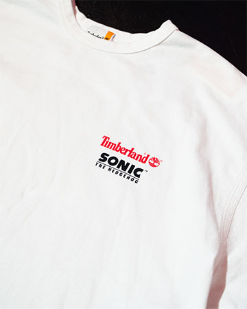 半袖Tシャツは、特別仕様のシャドウを背面に大胆にプリントし、左胸部分に「ソニックシリーズ」のタイトルロゴとレッドのティンバーランドロゴを配置。