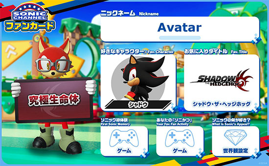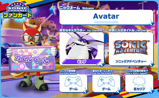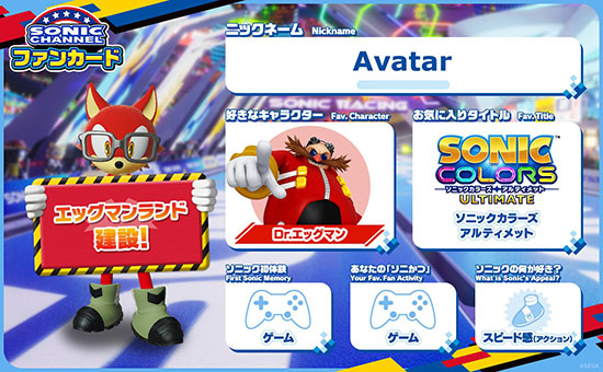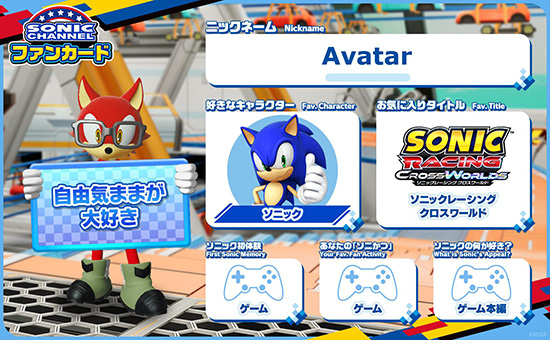お気に入りのゲームタイトルや好きなキャラを設定、オリジナルアバターを作成してあなただけのプロフィールカードを自由にカスタマイズ!SNSと連携して、他のソニックファンとカードを通じて交流しよう!